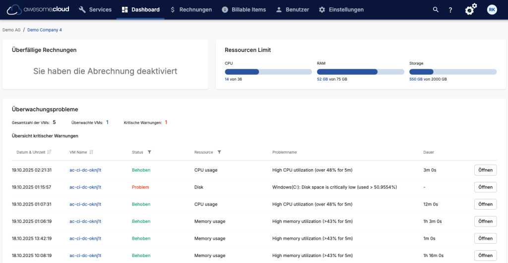 Egal, wie komplex die Umgebung eures Kunden ist – das Dashboard gibt euch einen klaren, vollständigen Überblick über alle Systeme und Services. Das macht Troubleshooting deutlich einfacher und spart wertvolle Zeit bei der Analyse von Problemen.
